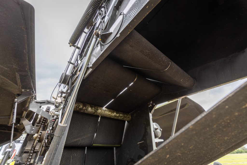 Claas kiest voor twee brede riemen in plaats van vier, vanwege de kortere snijlengte van de nieuwe pers (theoretisch 44 mm). Twee riemen betekent minder kieren. En als het gras of stro korter gesneden is, betekent dat minder verliezen.
