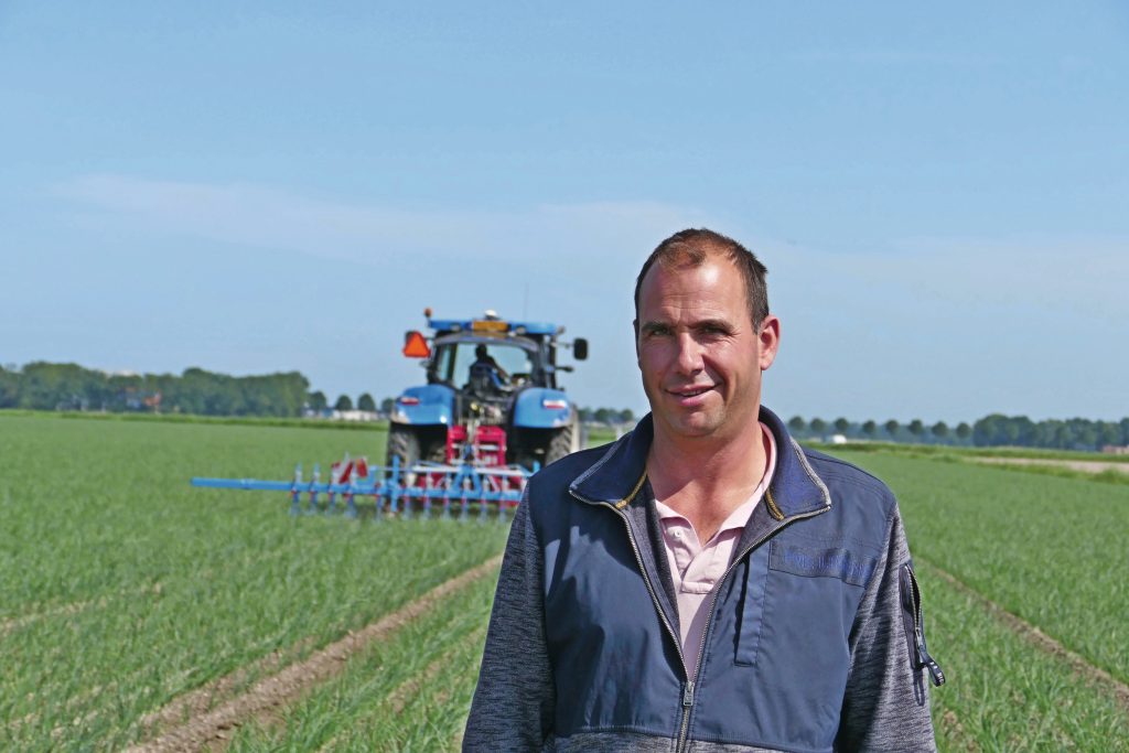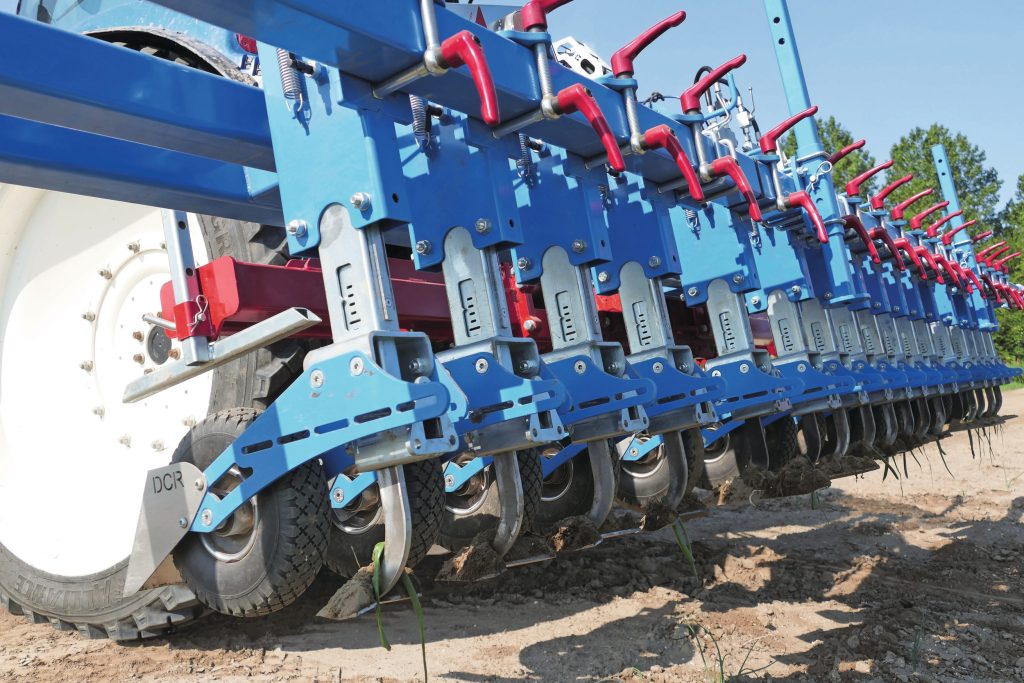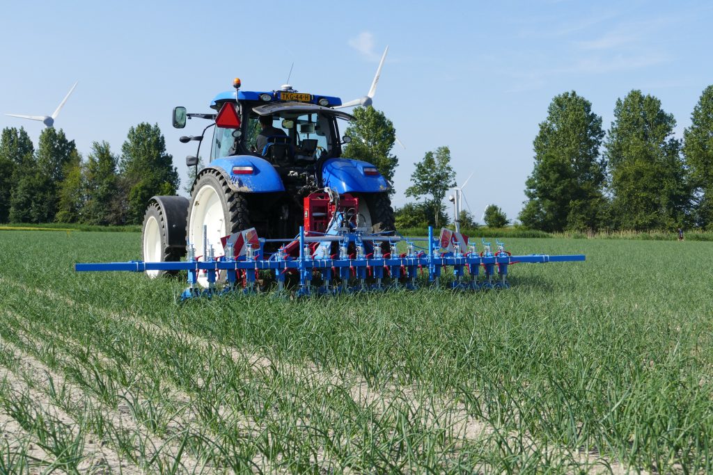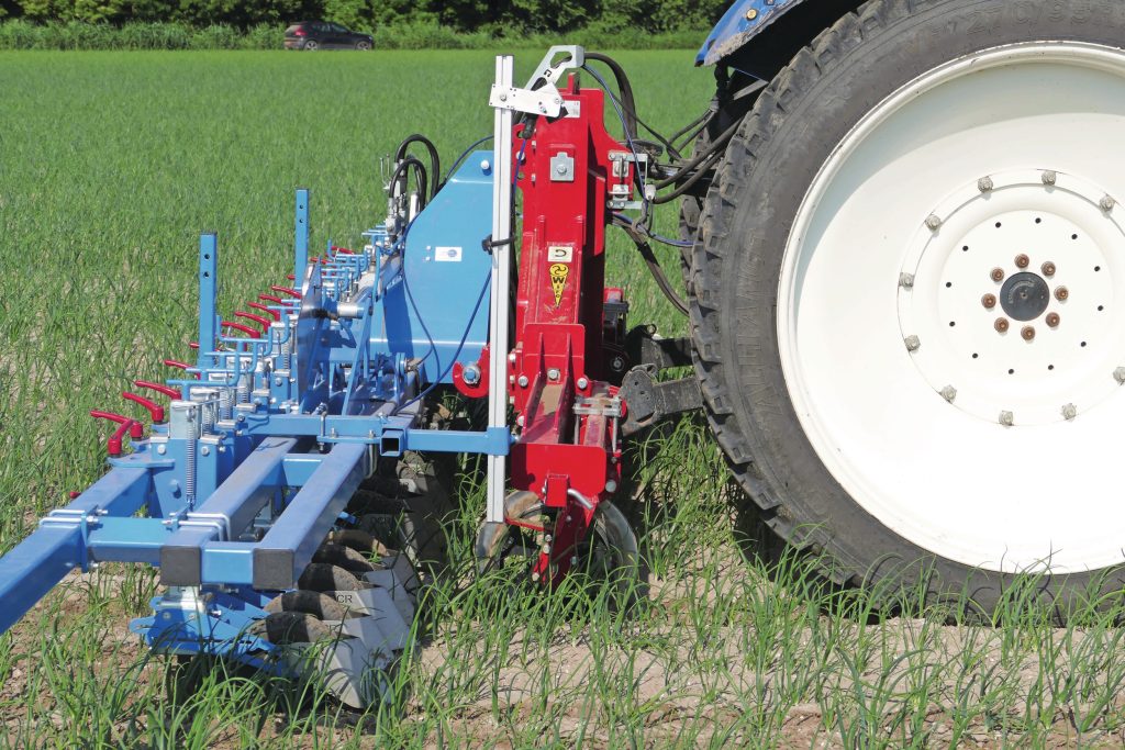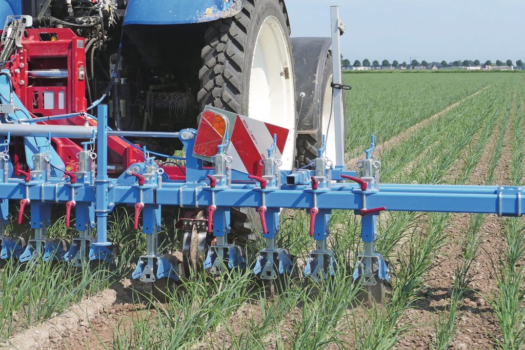 TREKKER zag de schoffel aan het werk in zaaiuien met een enkele ganzenvoet per element. Op dat punt is er in de uitvoering veel te kiezen. Een combinatie met schijven als bladbeschermers is mogelijk. Relevant als het gewas klein is en de grond bovenop hard. Een stel vleugelmessen is als alternatief te monteren. Voor teelten met een grotere rijenafstand zoals bieten is een combinatie van drie ganzenvoeten optie.