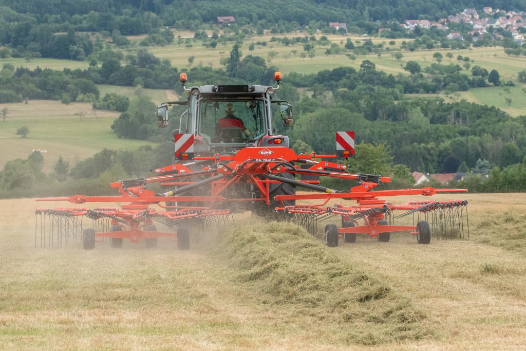 Machinefabrikant Kuhn breidt het aanbod gedragen dubbele harken uit. De GA 7631 P is 7,4 meter breed.