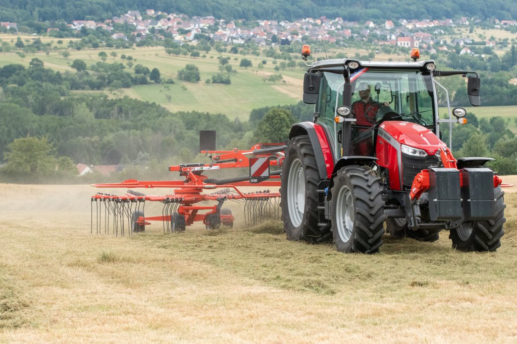 Voor de hark staat een Massey Ferguson 5M.115 met frontgewichten.