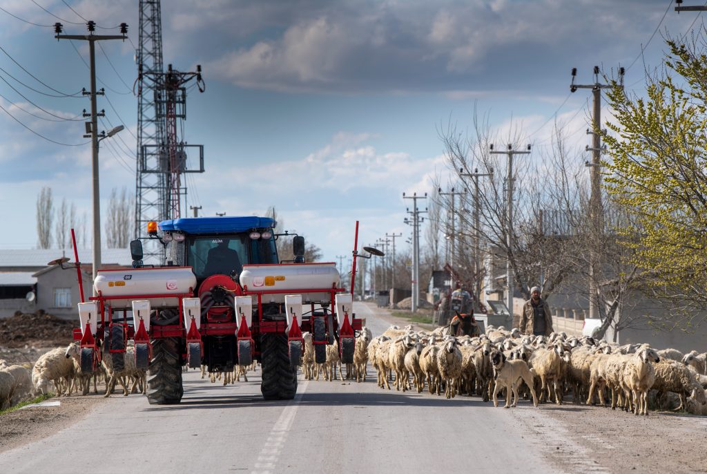 In Turkije tref je veel rondtrekkende schaapskuddes met een herder erbij. Deze New Holland met zaaimachine mindert geen vaart, maar niemand lijkt daar zenuwachtig van te worden – alles gaat goed. Foto’s: Mark Pasveer