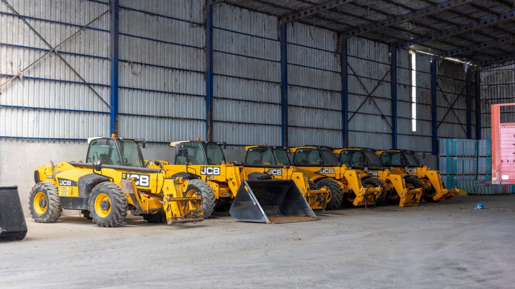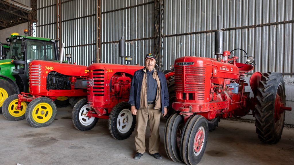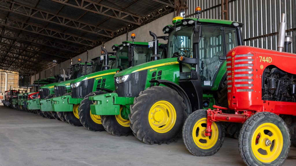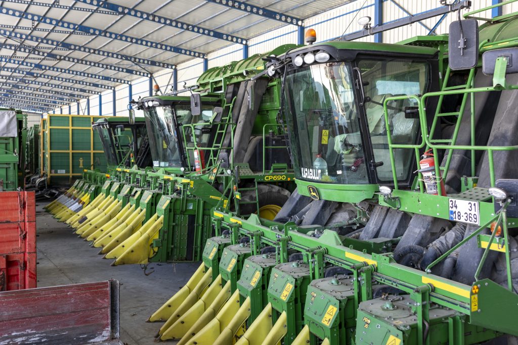 In een grote hal staan de trekkers bij elkaar. Twaalf stuks, van 60 tot 120 pk. Een wat vreemde aanblik, omdat geen van de trekkers een werktuig erachter heeft – ze staan netjes in het gelid met de heflatten tegen de wand geparkeerd. Vooraan de twee grootste: een John Deere 6100 M en 6120 M; achteraan staan meerdere John Deere 5303-cabrio’s. Ook in deze rij een aantal Massey Ferguson- en Same-smalspoortrekkers voor de druiventeelt.