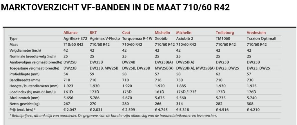 Op dit moment bieden zeven fabrikanten een VF 710/60 R42 aan. Het gaat om Michelin (Xeobib en Axiobib 2), Trelleborg (TM1060), Vredestein (Traxion Optimall), Alliance (Agriflex+ 372), BKT (Agrimax V-Flecto) en Ceat (Torquemax R-1W). Daarmee is er ruime keus. Al zorgt die diversiteit er ook voor dat de eigenschappen niet bij alle banden exact gelijk zijn.