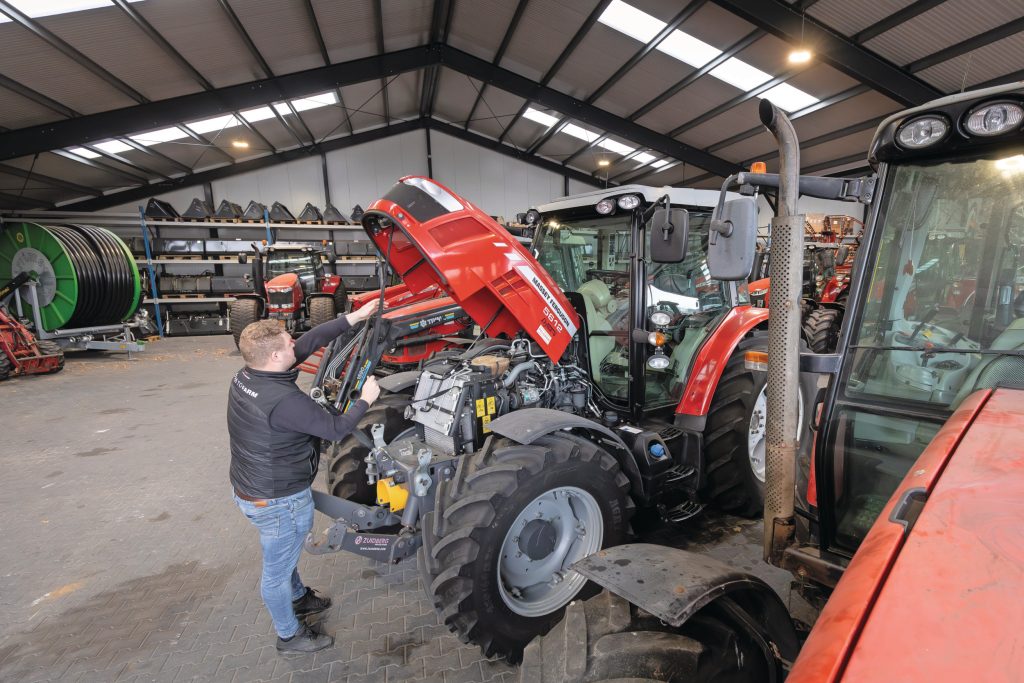 Dit type trekkers zie je vaak met een voorlader, of in sommige regio’s met een strodak. Dat betekent dat de vooras het krijgt te voorduren. Wie bij een occasion gaat kijken: check op speling op de stuurkogels en op het schommelstuk. Weet dat tót maart 2015 de trekkers zijn gebouwd met stuurkogels met een diameter van 35 millimeter, daarna is dat 40 millimeter. Als je stuurt en je voelt ruimte, weet dan dat het ongeveer €100 per stuurkogel kost (excl. arbeid) om die te vervangen – en dan krijg je de gemodificeerde 40 millimeter-kogel.