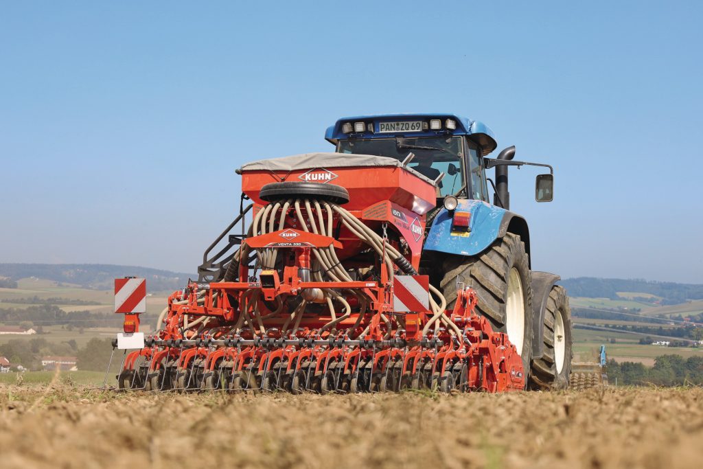 De Duitse akkerbouwer waar de werktuigtest zou plaatsvinden tijdens het najaarszaaien, gaf als eerste reactie op de korte kouterbalkafstand: ‘bij het mulchzaaien wordt het spannend’. De akkerbouwer zet de 3 meter brede Venta 330 pneumatische zaaimachine, opgebouwd op een Kuhn HRB 303-rotorkopeg, het meest in achter een New Holland TVT 145 met 147 pk. Die kan goed overweg met de 2.640 kilo wegende zaaicombinatie.