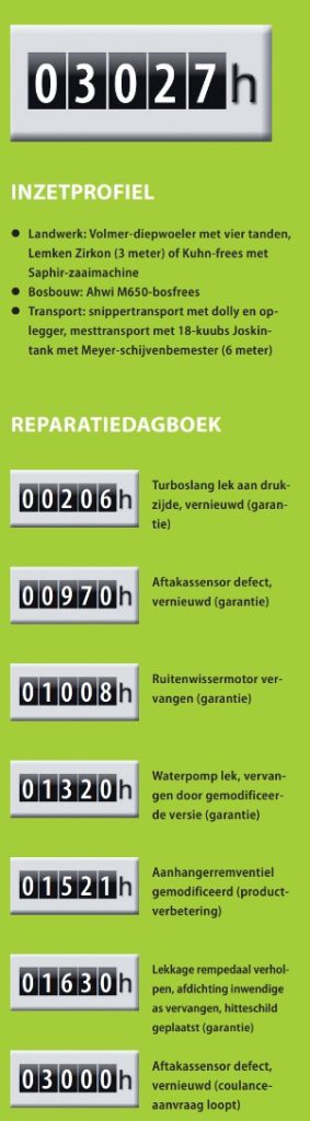 Bij 1.630 draaiuren blijkt dat er olie lekt langs de ingaande as van de transmissie. Daarvoor moest de trekker in tweeën worden gesplitst. Tegelijk met die reparatie heeft de dealer in het kader van productverbetering ook een hitteschild op de SCR-katalysator aangebracht.