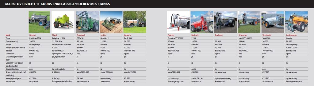 De enkelassige mesttanks in dit overzicht voldoen aan de volgende specificaties: een tankinhoud van 10.000 tot 12.000 liter, eenvoudig uitgevoerd (één tank, één as, één pomp) en banden eronder die minimaal 80 centimeter breed zijn. In Nederland leveren elf merken een dergelijke tank. Bij sommige fabrikanten, zoals Joskin, is het aanbod aan 11-kuubs mesttanks groot. Maar zoals gezegd beperken we ons in dit overzicht tot de eenvoudige uitvoeringen waarbij de tank zo laag mogelijk tussen de wielen ligt. Dit voor een laag zwaartepunt en dus stabiliteit.