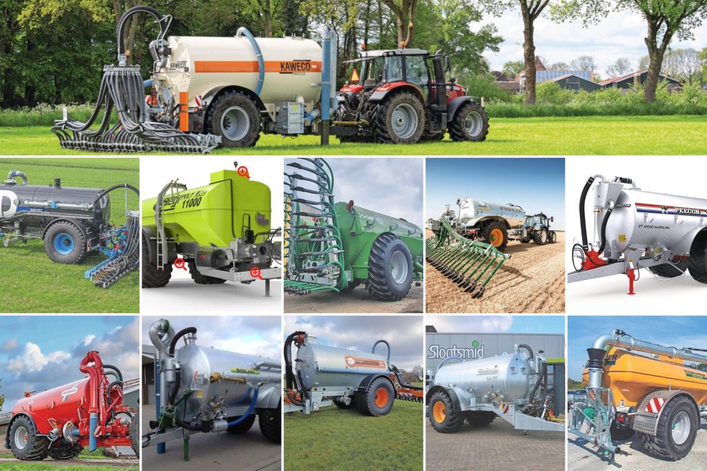 TREKKER heeft elf ‘boerenmesttanks’ op een rij gezet. De mesttanks hebben een tankinhoud van 10.000 tot 12.000 liter, zijn eenvoudig uitgevoerd (één tank, één as, één pomp) en hebben banden eronder die minimaal 80 centimeter breed zijn. Juist die eenvoud maakt deze enkelassige mestanks aantrekkelijk voor veehouders. Foto’s: fabrikanten