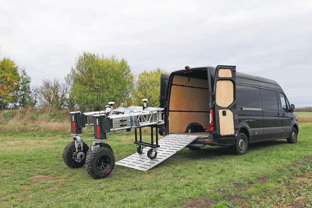 Voor transport past het opvouwbare chassis in een standaard bestelbus. Daardoor kan één persoon de robot in het veld opstellen volgens de fabrikant.