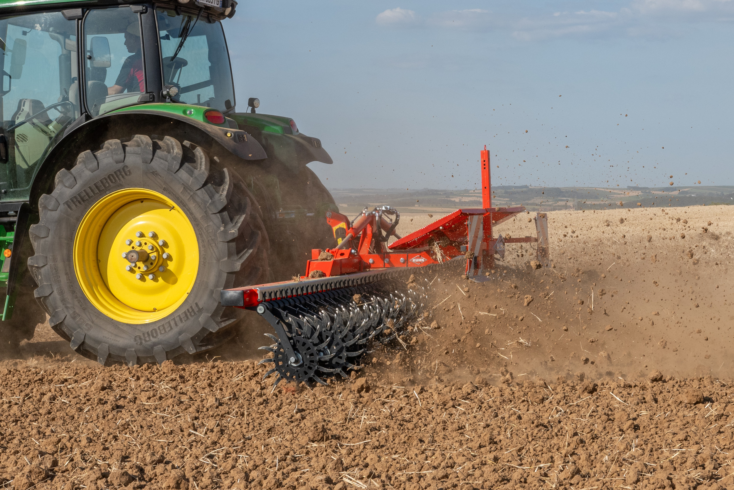 De nieuwe roterende schoffel Starliner van Kuhn breekt met stervormige elementen de korsten tijdens een velddemo in Frankrijk.